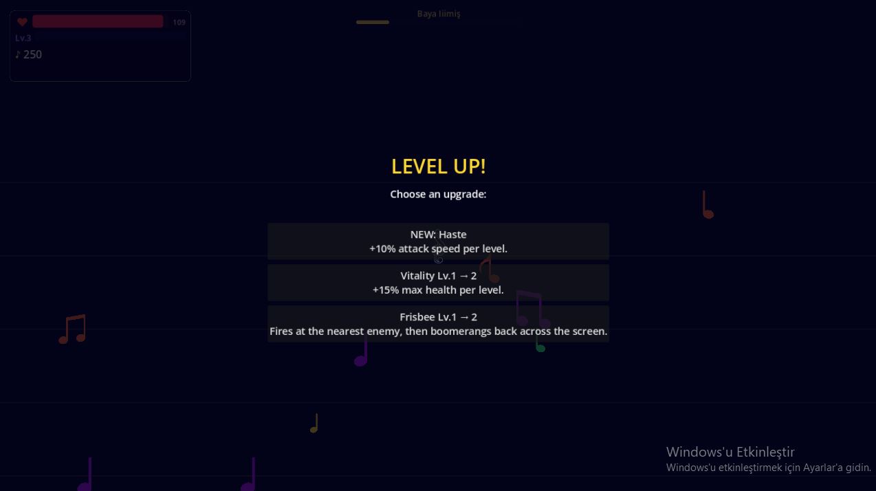 Loadout and upgradesUse weapons like the Whip, Knife, Molotov, Fire Wand, Yo-yo, Frisbee, and Aura. Stack passives such as Swift Feet, Vitality, and damage bonuses. Level up, pick upgrades, and tailor your build to the song and genre you choose.Survive until the final note.