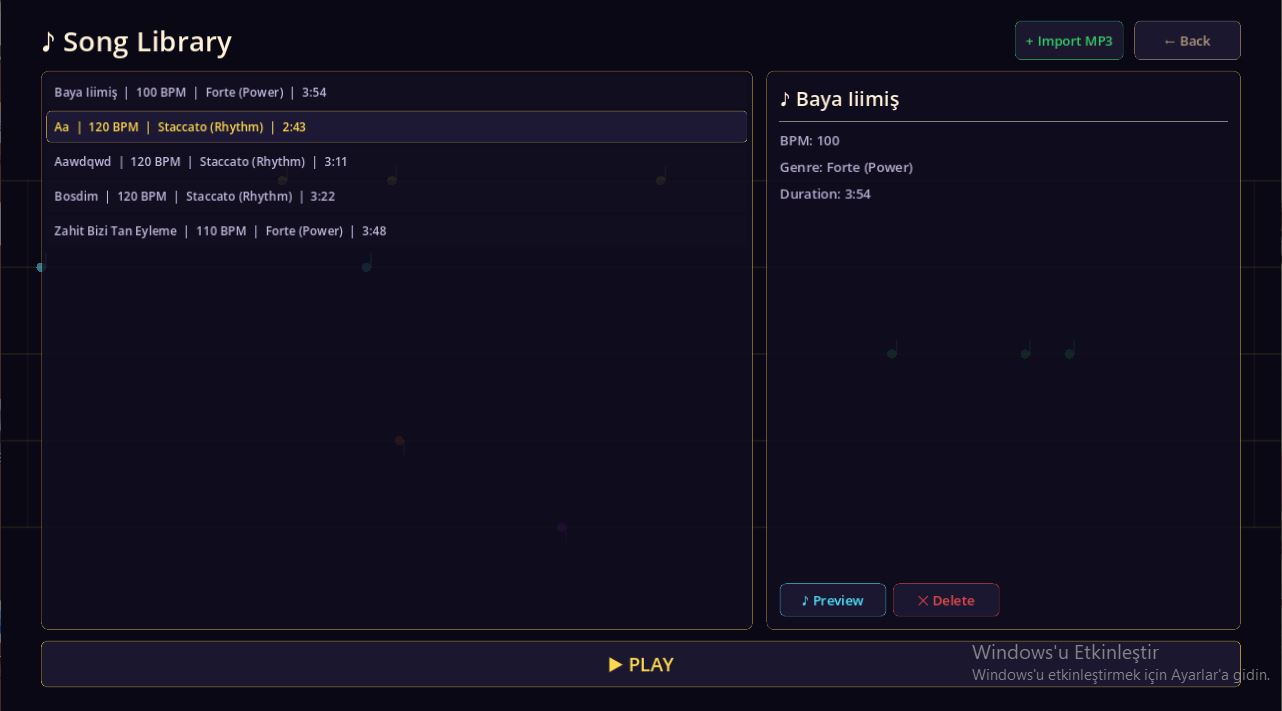 A survivor roguelike where you import your own music. Enemies spawn on the beat in five lanes, and song genre (Allegro, Forte, Adagio, etc.) changes buffs and playstyle. Unlock weapons and passives, level up, and outlast the rhythm.